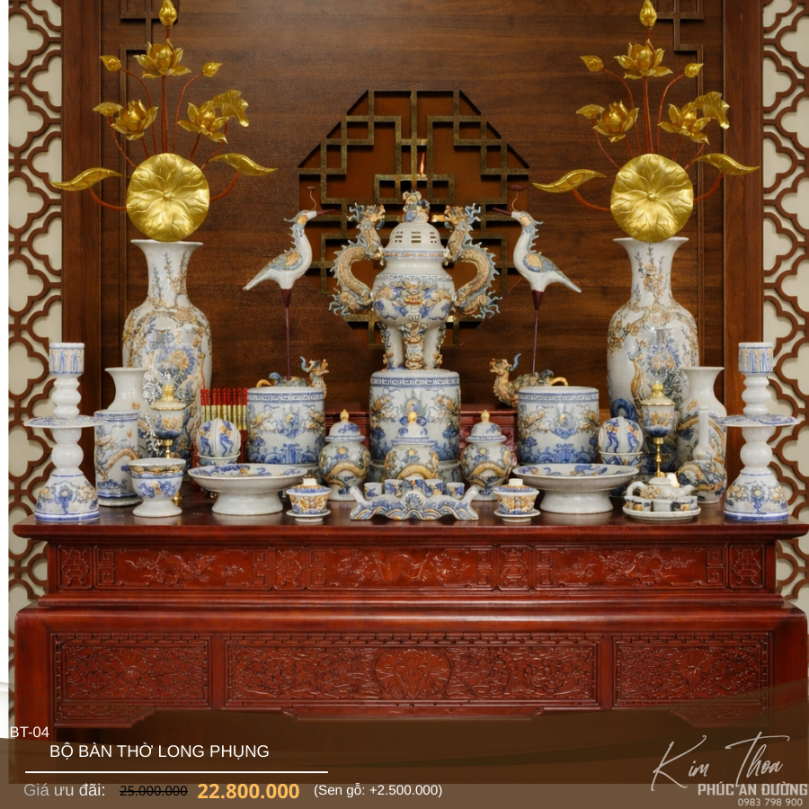 Bộ bàn thờ Long Phụng BT-04 là mẫu đồ thờ gốm sứ cao cấp, nổi bật với họa tiết rồng – phượng vẽ tay mang ý nghĩa cát tường, hưng thịnh và tôn nghiêm trong văn hóa thờ cúng truyền thống.