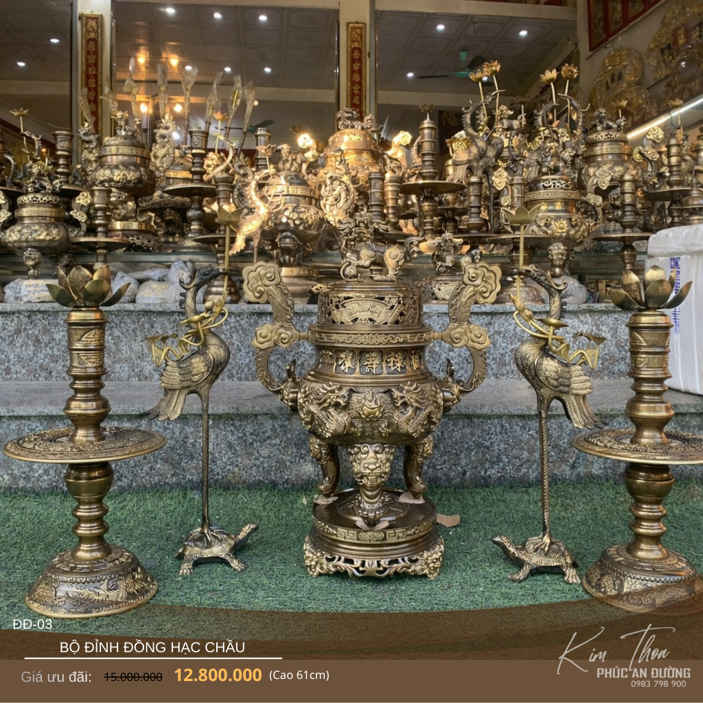 Bộ đỉnh đồng ĐĐ-03 là mẫu ngũ sự dùng cho bàn thờ, nổi bật với cặp hạc chầu đứng trên rùa đặt hai bên đỉnh, tạo bố cục cân đối và trang nghiêm cho không gian thờ.