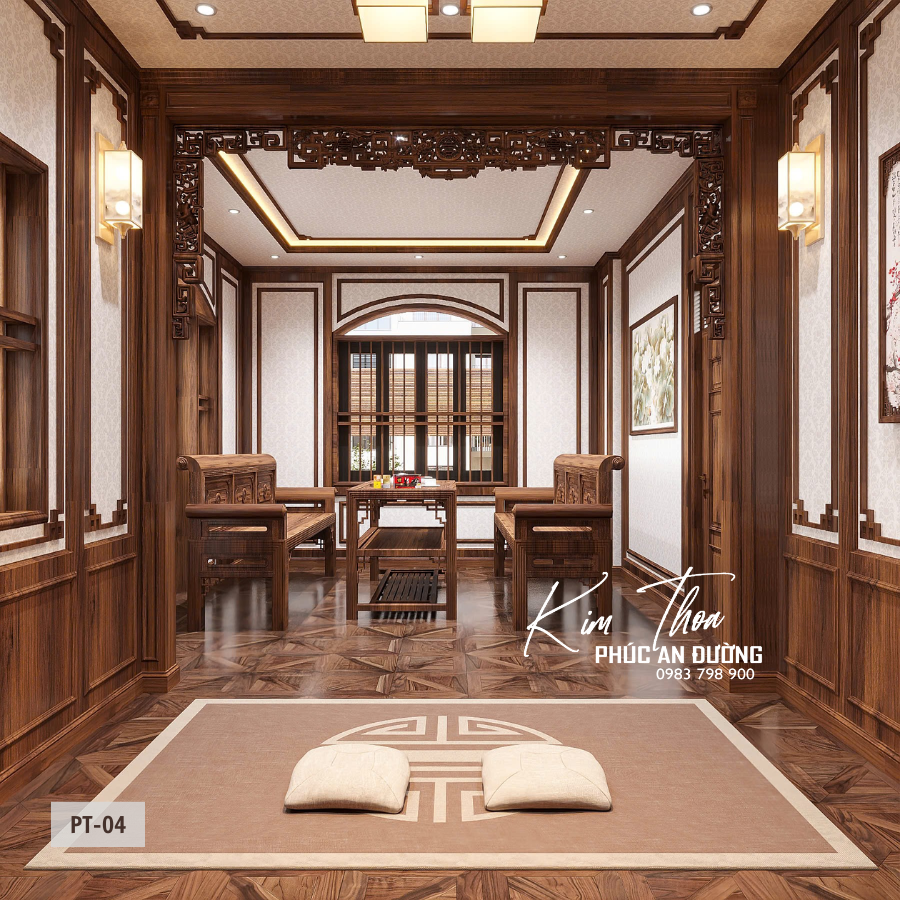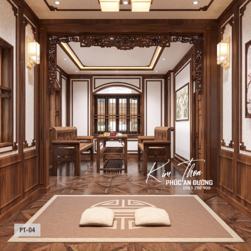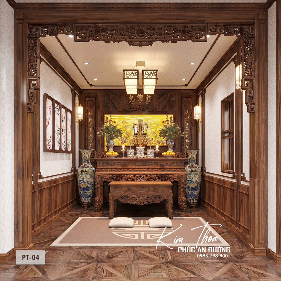 Phòng thờ PT-04 được Phúc An Đường thiết kế theo phong cách phòng thờ truyền thống Bắc Bộ, nhấn mạnh sự trang nghiêm – cân đối – bền giá trị theo thời gian. Mẫu phù hợp với những gia đình có diện tích phòng thờ tương đối rộng, mong muốn không gian thờ vừa chuẩn mực, vừa thuận tiện cho sinh hoạt lễ nghi.